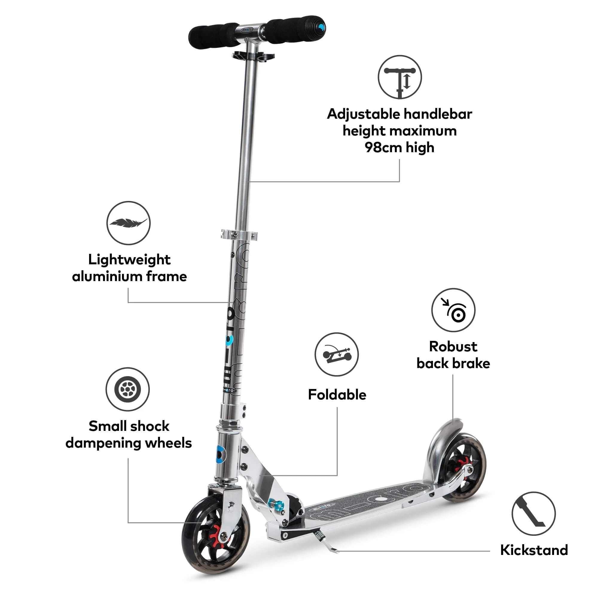 The Micro Speed Scooter in Silver is among our most popular Micro Scooters as it can been used comfortably by both adults and children. It comes with medium sized 145mm wheels which provide a smooth ride but also make the speed considerably lighter than some other adult scooters in the range, it weighs in at 3.8 kgs.