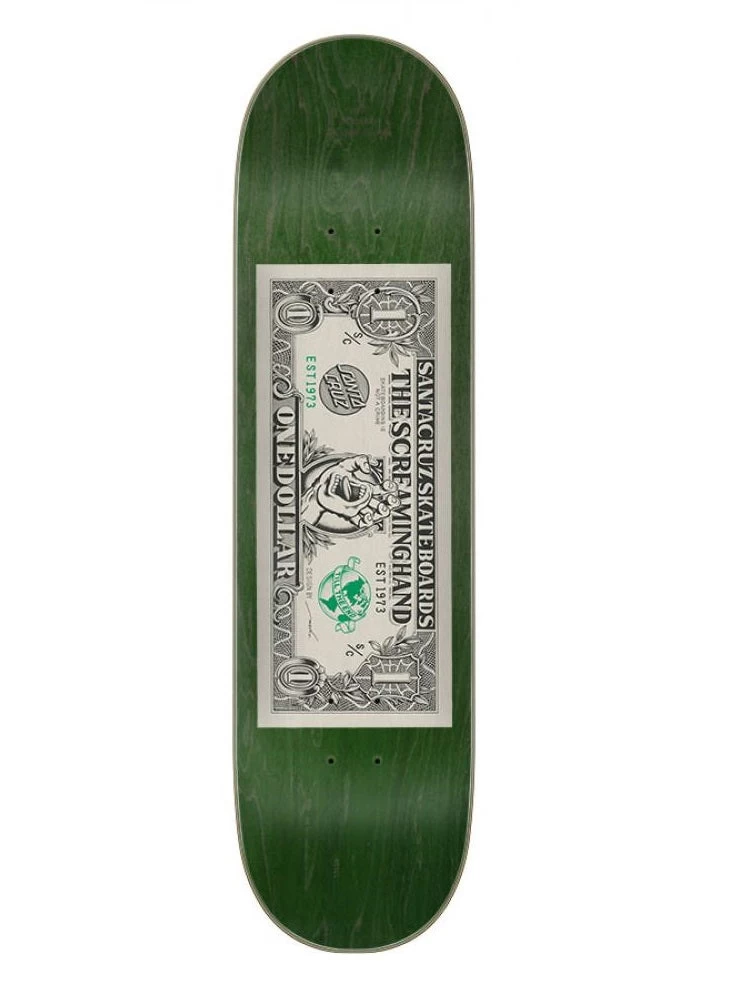 Free grip included when you buy the Santa Cruz Dollar Hand Deck from Slick’s Skate Store. The board measures in at 8.25″ wide by 31.8″ long.