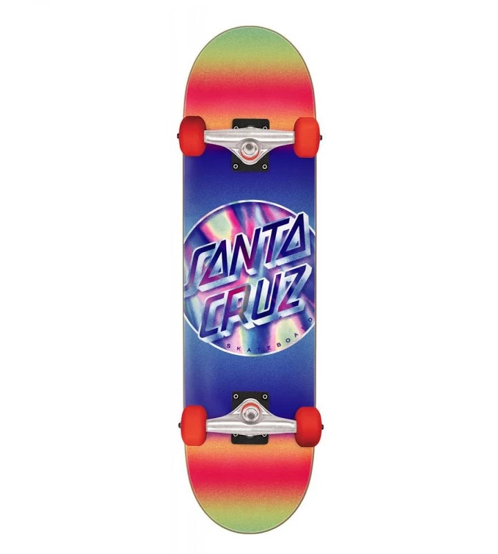 The Santa Cruz Iridescent Dot Large Skateboard measures 8.25″ wide by 31.5″ long.
