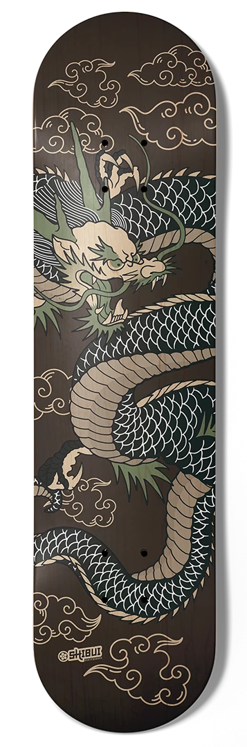 The Shibui Ryu Dragon is a modern skateboard deck with a Japanese tattoo inspired design. Made from 100% Canadian hard rock maple from managed forests. Generous kick tail with medium concave nose and tail that are great for performing freestyle tricks and cruising.