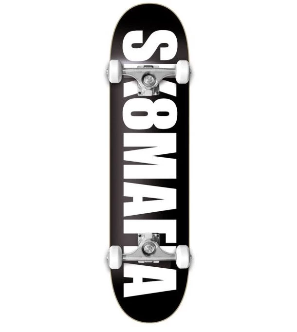 The SK8 Mafia OG Logo Skateboard in Black measures 7.87″ wide by 31.6″ long. It comes with 5.0 SK8 Mafia trucks, 52mm 100a wheels and abec 7 bearings.