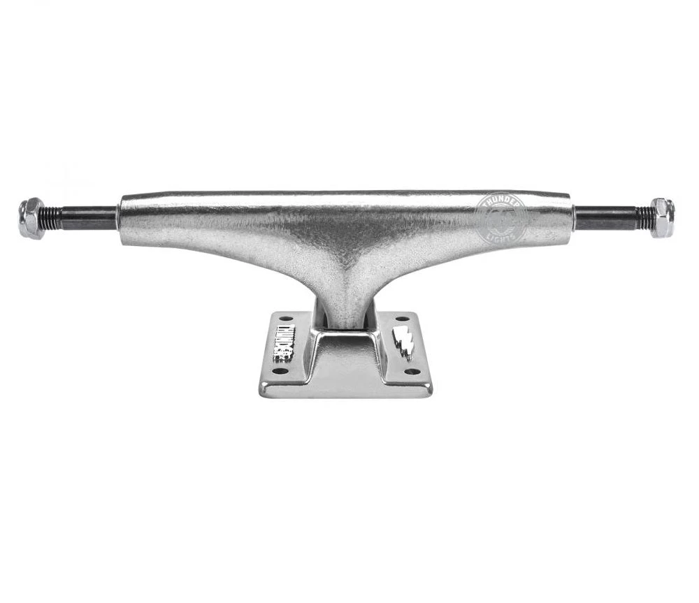 Pair of Thunder Lights II Skateboard Trucks in 148, suitable for decks with a width between 8.2 and 8.4 inches. The standard Thunder lights are some of our best selling trucks and are silver all over with just the Thunder logo in white across the hangars.